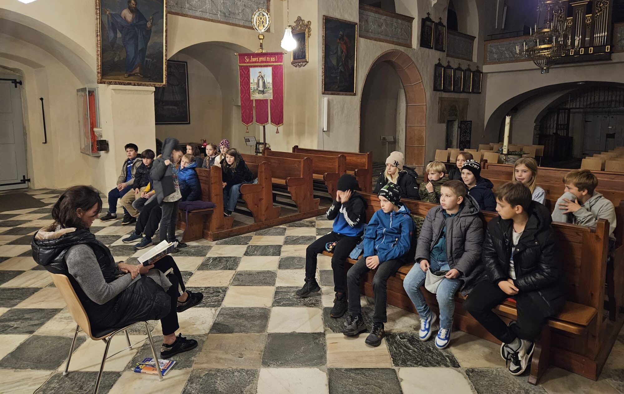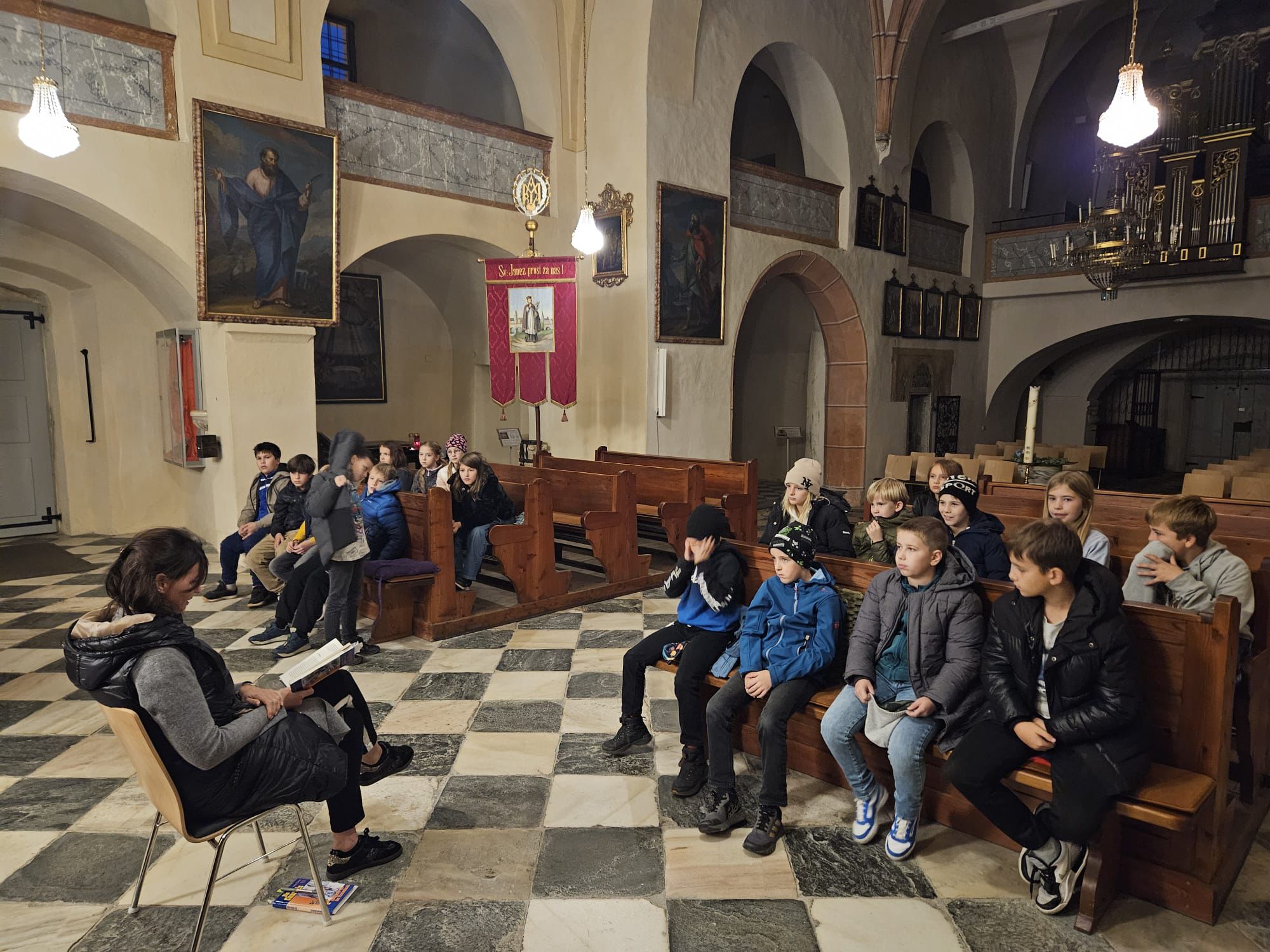 Nato so navdušeni prostovoljci prebrali prvi del knjige. Otroci so napeto poslušali kriminalno zgodbo, v kateri so ministranti zašli v zelo nevarne situacije. Najbolj zanimivi liki zgodbe so bili strašljivi diakon, ki je v spovednici odložil torbo, policisti, ki so vdrli v cerkev, in pes sredi oltarja.