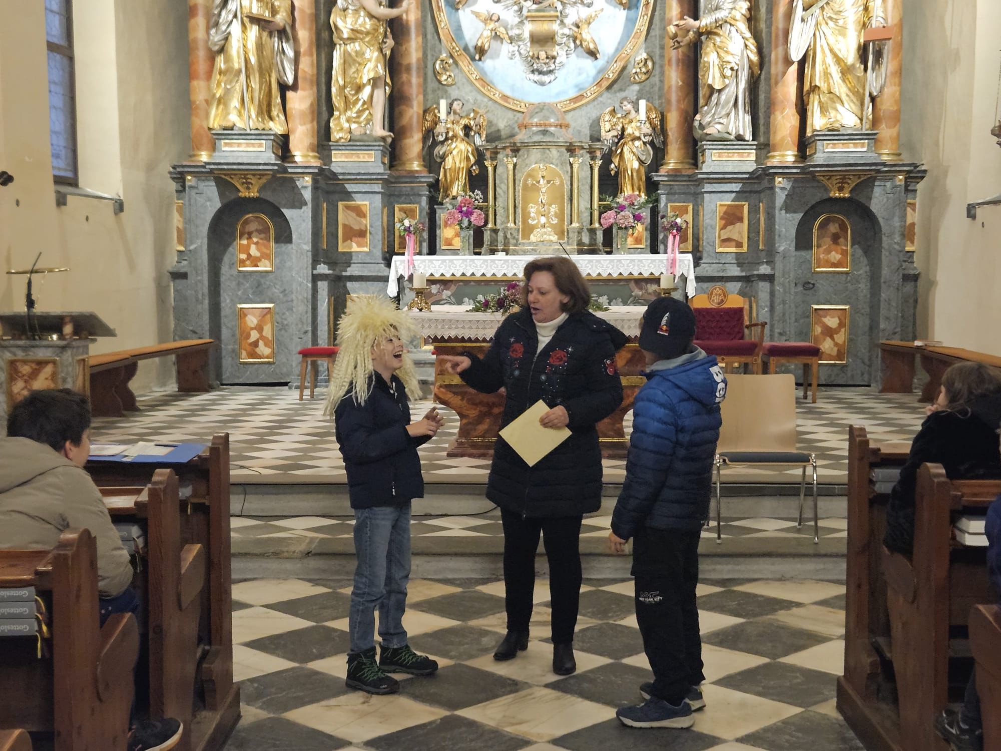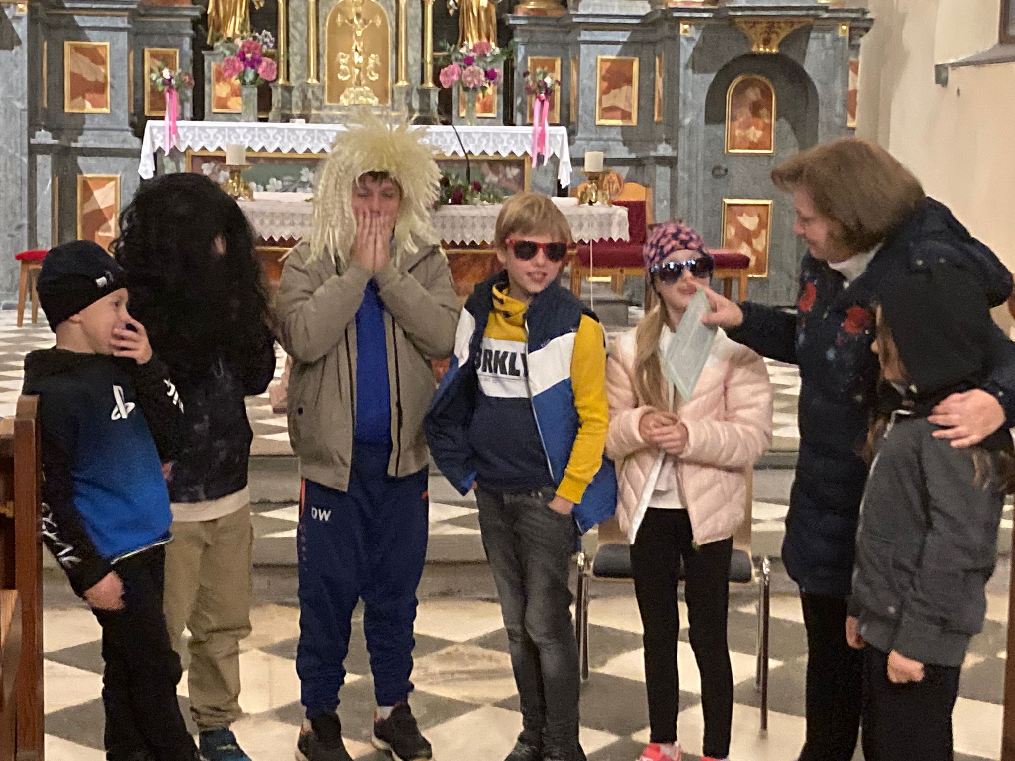 Anschließend wurde der erste Teil des Buches „Die Churchis – der goldene Kelch“ von lesebegeisterten Freiwilligen vorgetragen. Gespannt lauschten die Kinder dem Kriminalfall, bei dem Ministranten in höchst gefährliche Situationen gerieten. Ein unheimlicher Diakon, der eine Tasche im Beichtstuhl ablegt, Polizisten, die die Kirche stürmen und ein Hund mitten im Altarraum waren die Höhepunkte.
