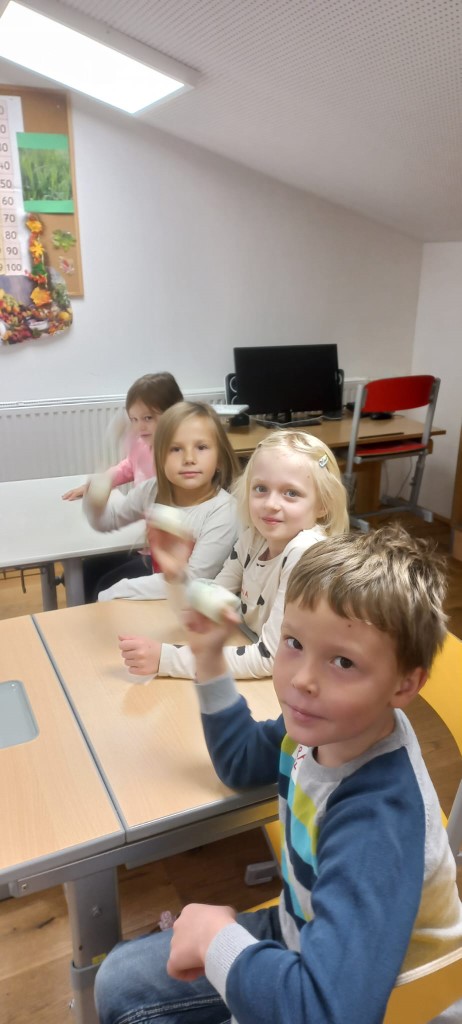Zu Beginn wurden wichtige Nährstoffe der Milch besprochen, Milchprodukte eingeteilt und das Gütesiegel wurde erklärt. Auch der Weg der Milch von der Kuh über die Molkerei bis ins Geschäft wurde den Kindern sehr anschaulich nähergebracht. Mit großem Eifer stellten die Kinder selbst Butter her. Nach kräftigem Schütteln war es schließlich soweit, die frische, selbstgemachte Butter wurde auf Brote gestrichen und verspeist. Mit großem Ehrgeiz versuchten die Kinder möglichst viel „Milch“ aus Übungseutern zu melken.