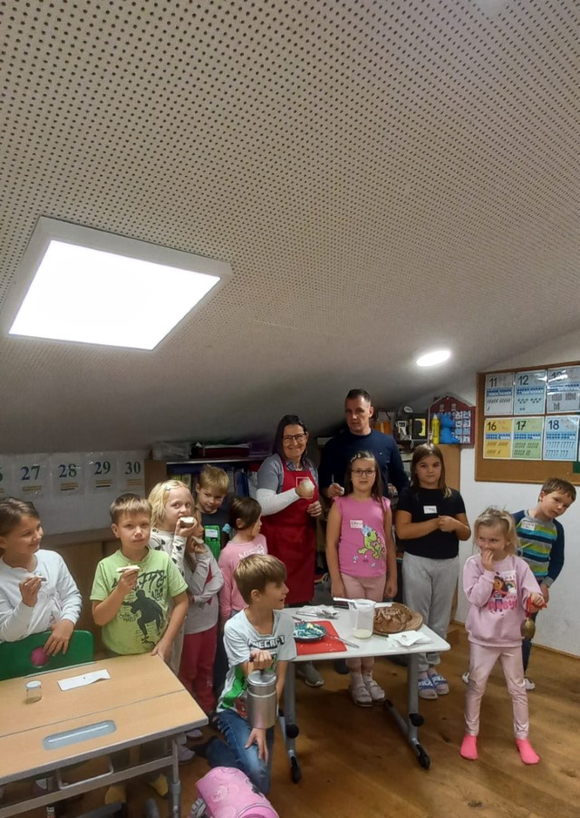 Na začetku so se pogovarjali o pomembnih hranilih v mleku, razvrstili mlečne izdelke in razložili znak kakovosti. Otrokom so tudi zelo nazorno predstavili pot mleka od krave preko mlekarne do trgovine. Otroci so z velikim navdušenjem sami izdelali maslo. Po močnem tresenju mleka je bil končno čas, da so sveže narejeno maslo namazali na kruh in pojedli. Otroci so z velikim zanosom poskušali iz vadbenih krav izmolsti čim več „mleka“.