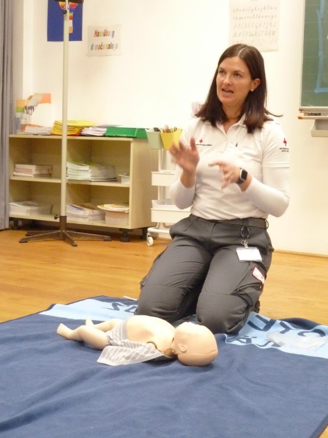 20. novembra so se učiteljice in učitelji naše šole udeležili tečaja prve pomoči. Pod vodstvom izkušene reševalke Lise Doujak so se udeleženci naučili praktičnih življenjsko pomembnih ukrepov, kot so stabilni bočni položaj, oživljanje in uporaba defibrilatorja. Posebna pozornost je bila namenjena nujnim primerom v šolskem vsakdanu – od manjših poškodb na šolskem dvorišču do hudih alergijskih reakcij. Udeleženci so pokazali veliko zanimanje in izmenjali dosedanje izkušnje. Vsi so poudarili, kako pomembno je redno osveževanje znanja, da se v nujnih primerih lahko hitro in varno ukrepa.