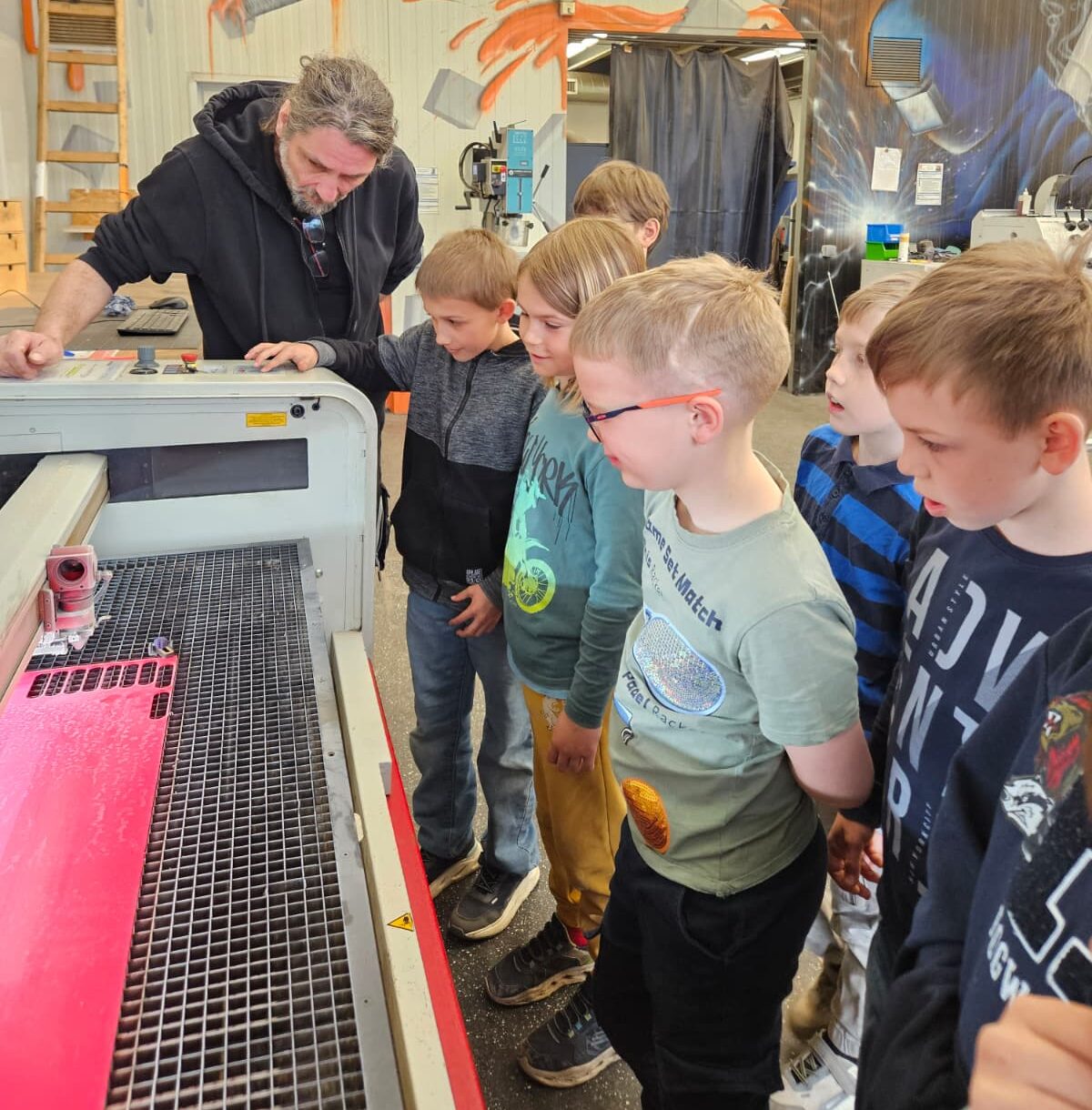 Am 14. April machte sich die 3. Klasse auf den Weg nach Klagenfurt um die Werkstätte „Makerspace“ zu besuchen. Dort lernten die Schülerinnen und Schüler das Konzept der Werkstätte kennen: private Personen oder Firmen können dort ihre innovativen Ideen verwirklichen. Dazu darf man alle modernen Geräte wie 3D-Drucker, Laserschneider, Nähmaschinen usw. benutzen. Die Kinder fanden den idealen Ort um gestalten zu können, egal ob Holz-, Kunststoff- oder Metallbearbeitung. Hier ist für jeden etwas dabei! Die „Maker“ aus der 3. Klasse pressten geschreddertes Altplastik in Formen und erhielten so einen individuellen Kreisel. Mit dem Lasercutter wurde die Form für einen „Fidget Spinner“ aus einer Plastikplatte ausgeschnitten und mit Kugellagern drehbar gemacht. Viel gesehen, viel gehört, viel probiert und einiges an Wissen mitgenommen. Vielen Dank an Herrn Hilpert von der KEM-Carnica für die finanzielle Unterstützung!