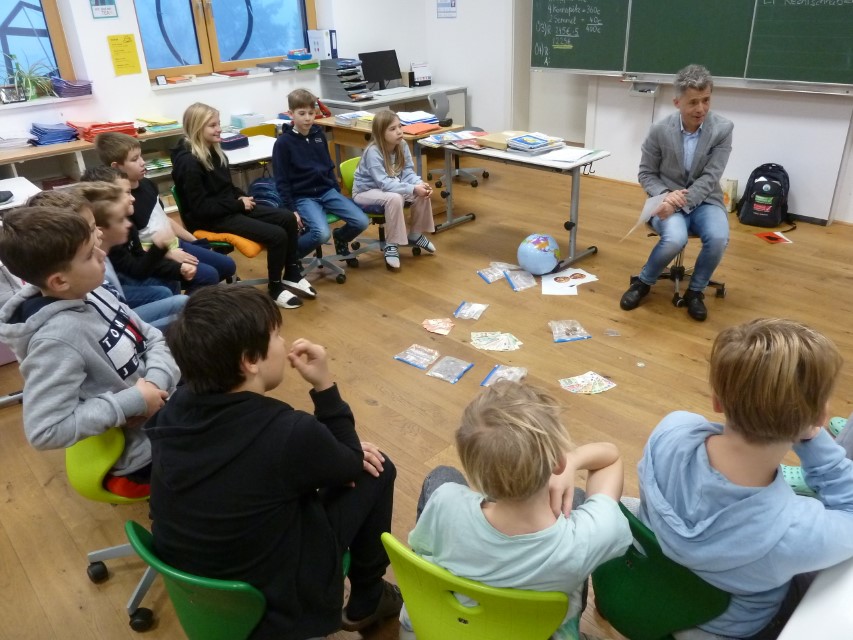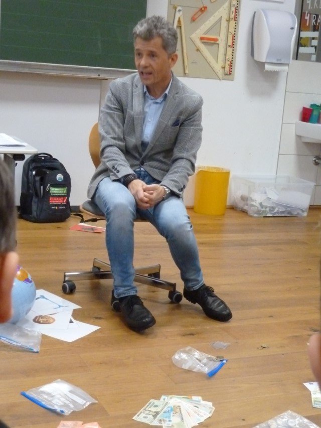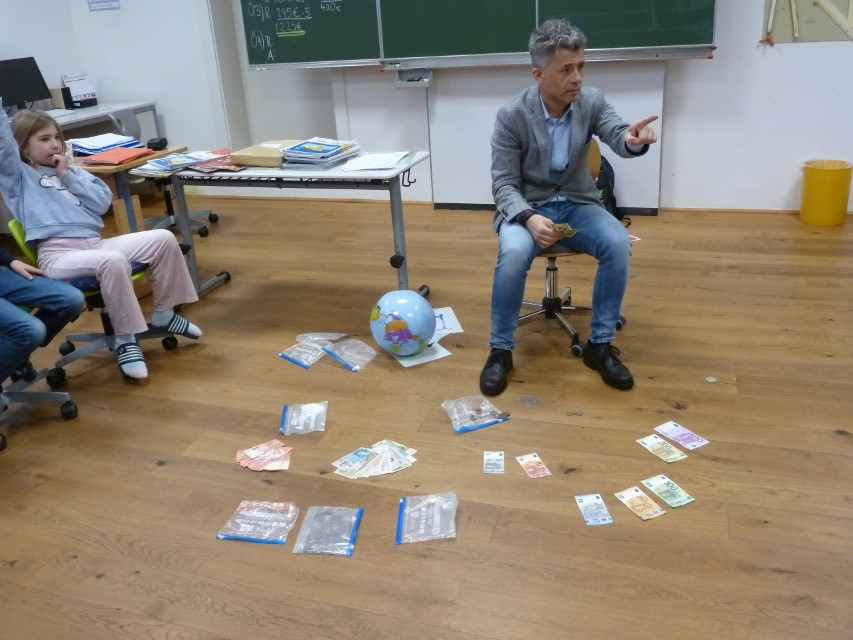 Na zelo otrokom prijazen način je vodja organizacije Andreas Pregl obravnaval z učenci temo denarja: Od kod sploh prihaja denar? Za kaj ga lahko ali bi ga smeli porabiti? In kako načrtovati majhen proračun?