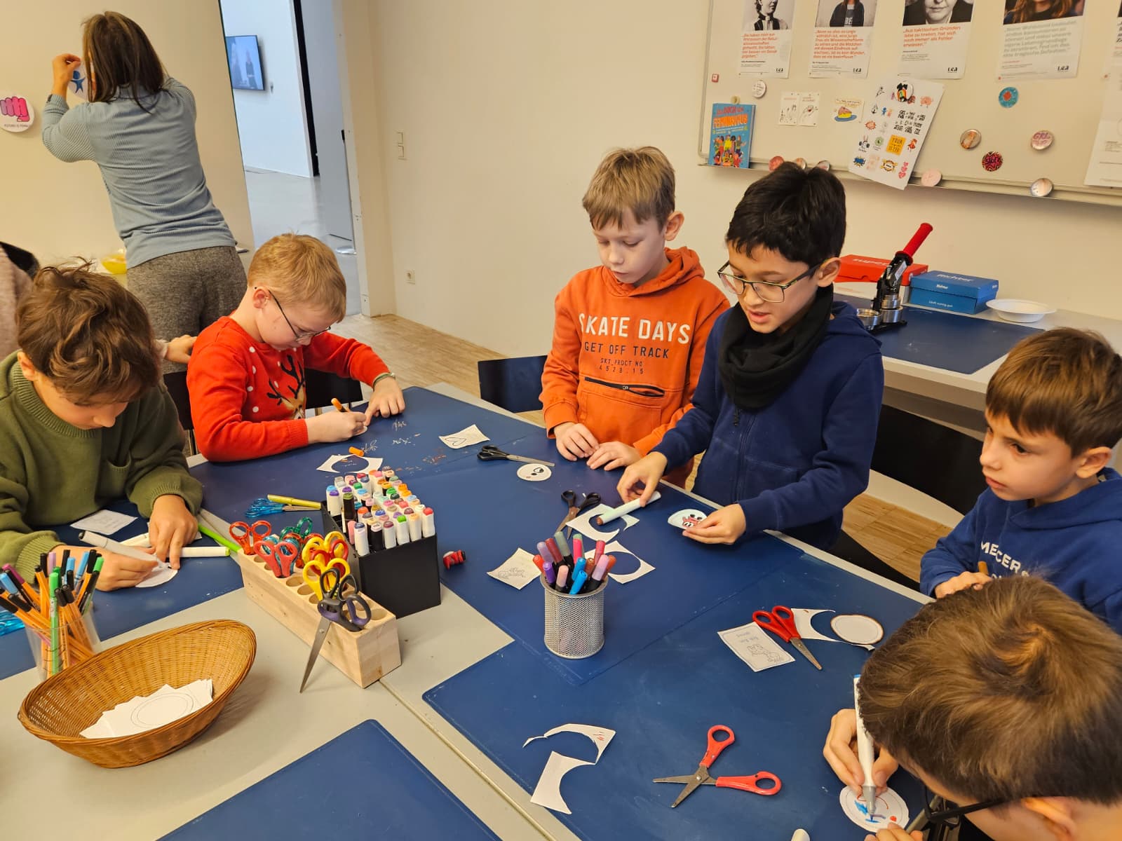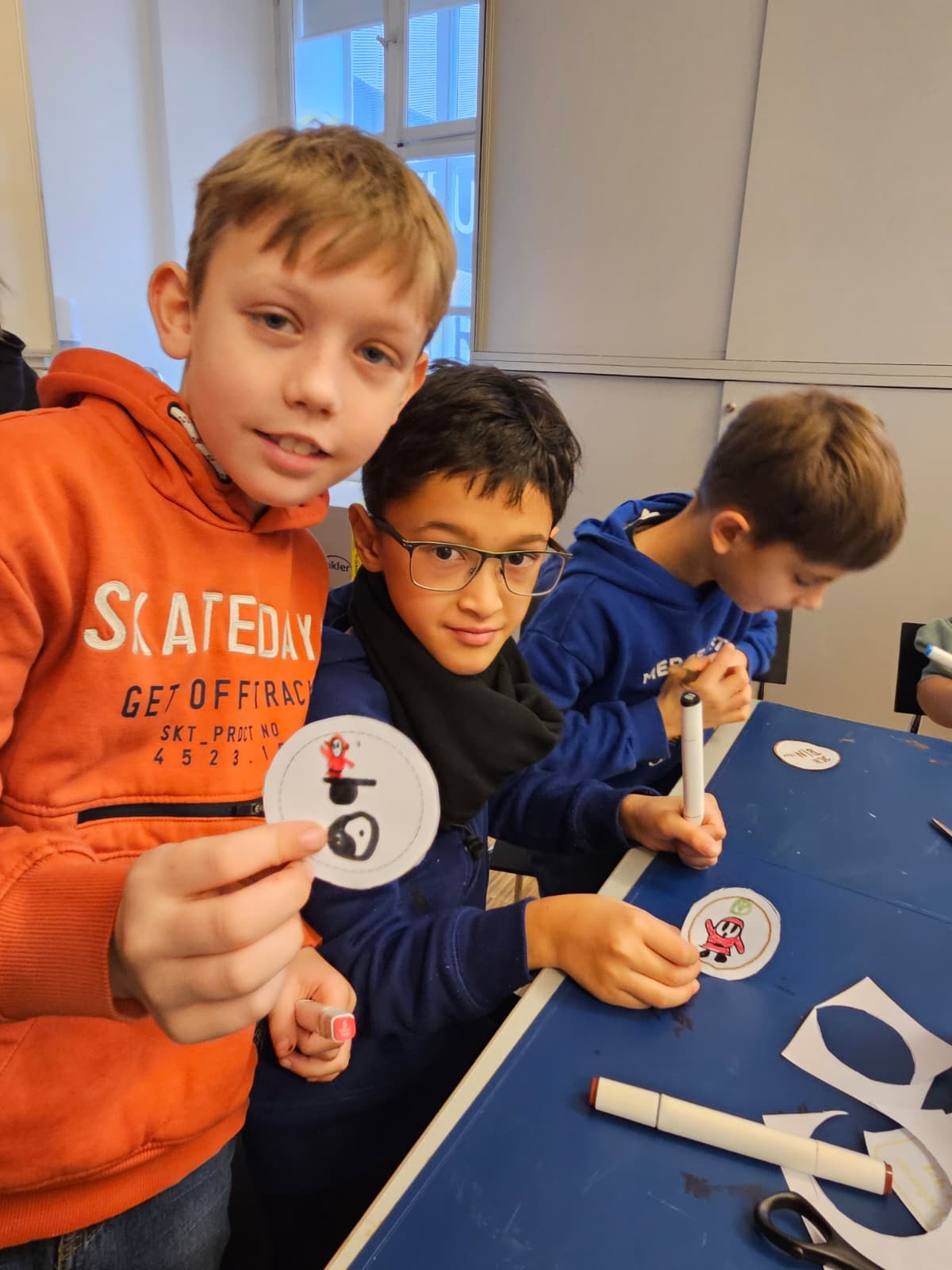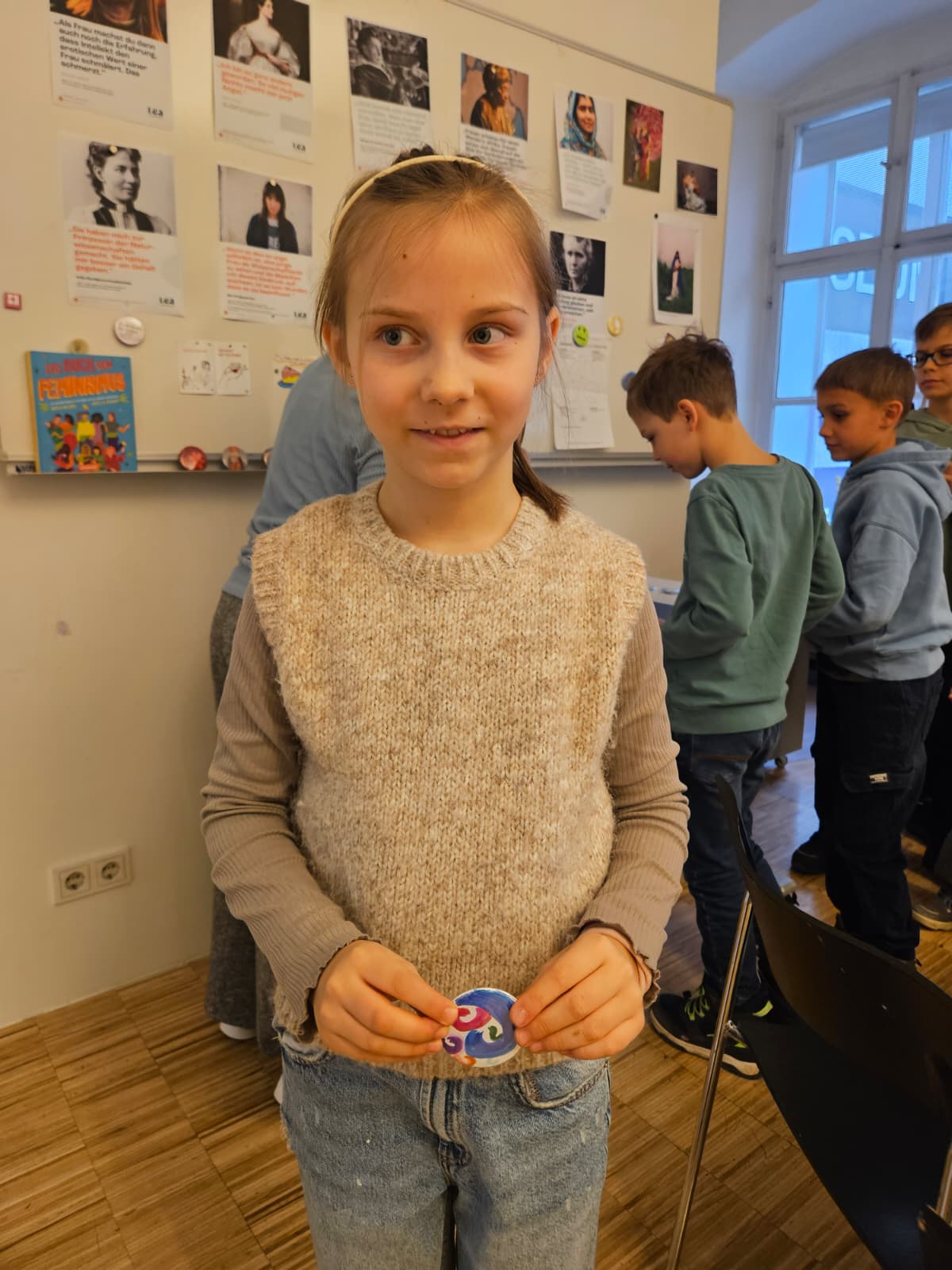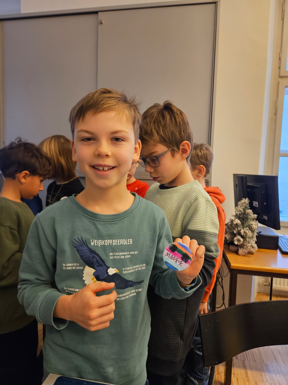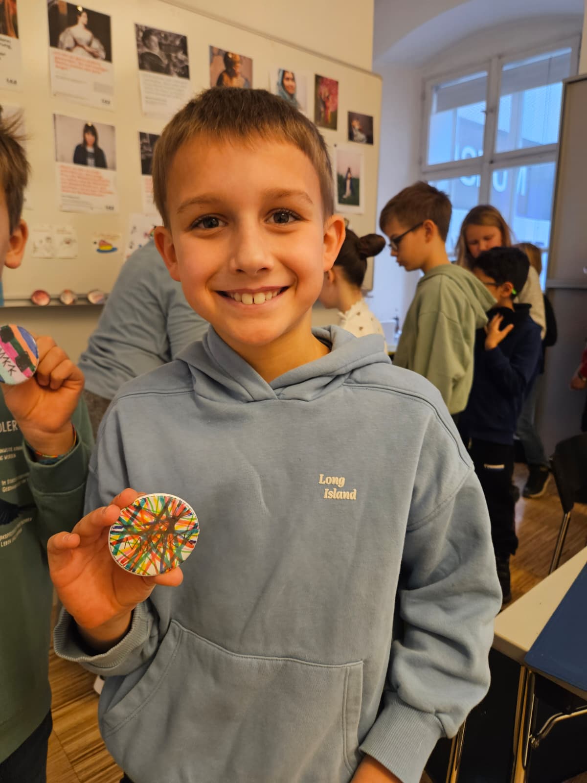 Im Anschluss konnten die Kinder selbst kreativ werden und eigene Buttons gestalten, die sie als Erinnerung an diesen besonderen Tag mit nach Hause nehmen durften. Ein gelungener Tag voller Kunst, Kreativität und neuer Eindrücke!