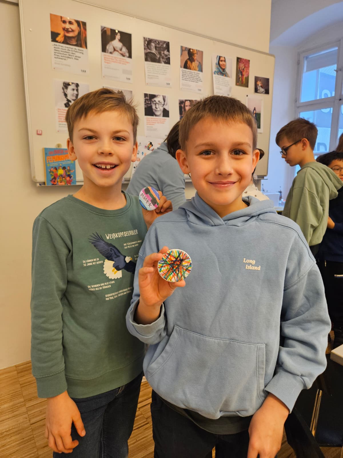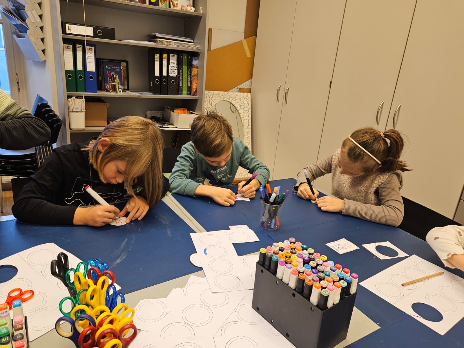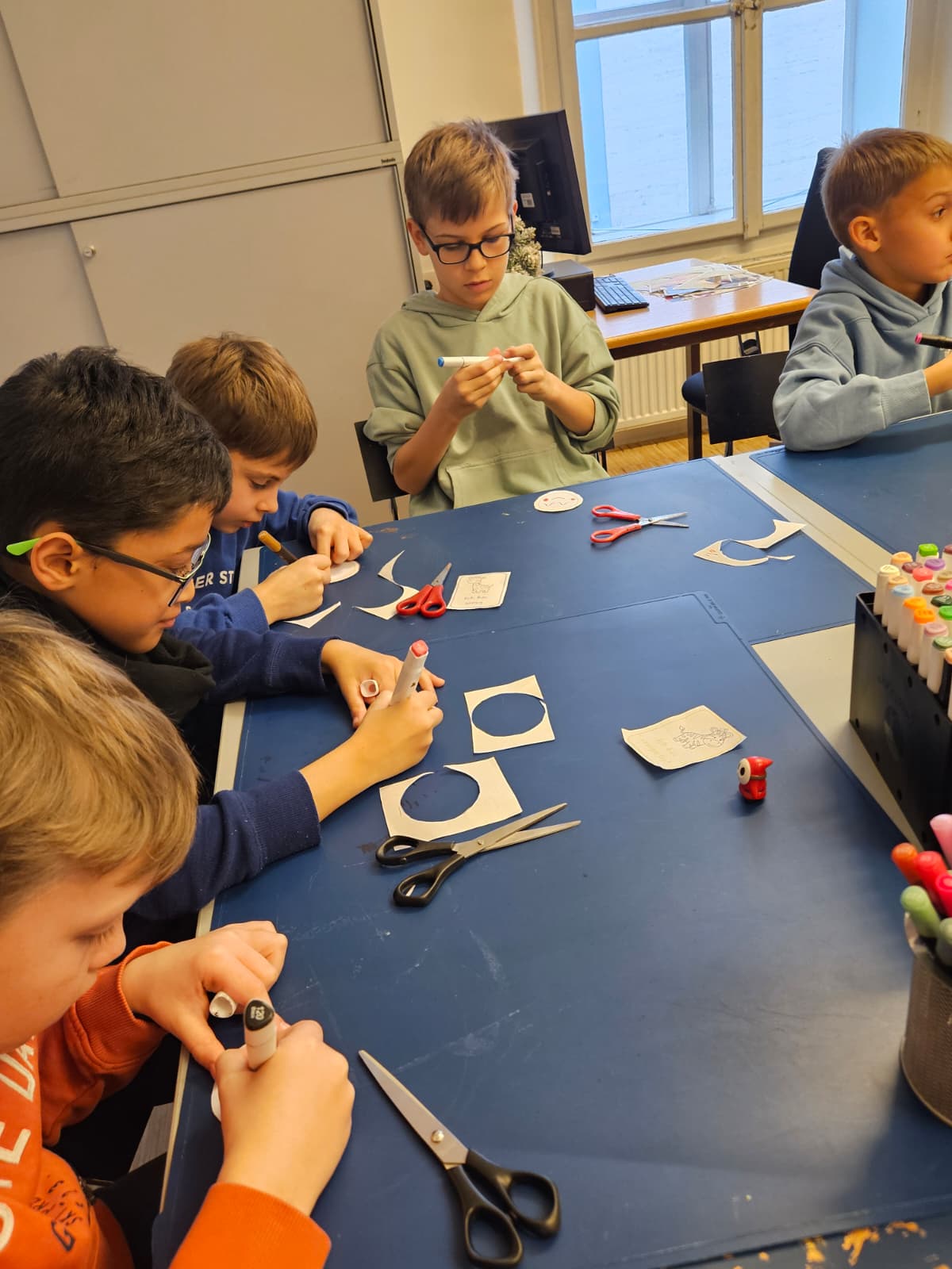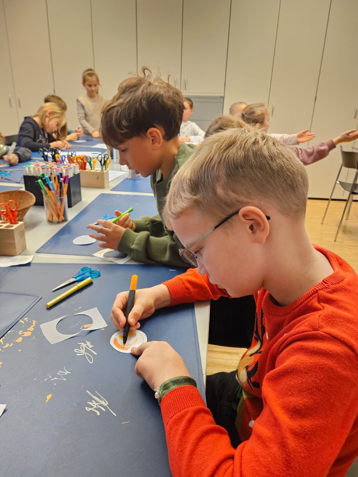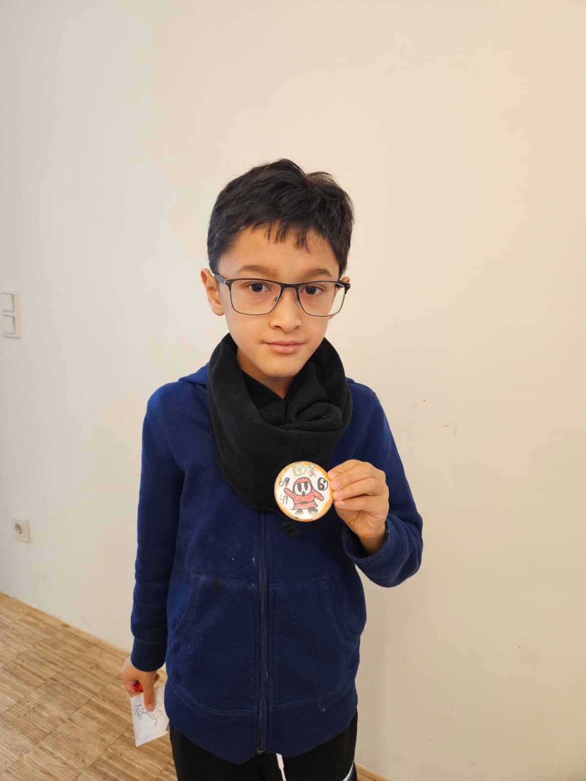 Im Anschluss konnten die Kinder selbst kreativ werden und eigene Buttons gestalten, die sie als Erinnerung an diesen besonderen Tag mit nach Hause nehmen durften. Ein gelungener Tag voller Kunst, Kreativität und neuer Eindrücke!